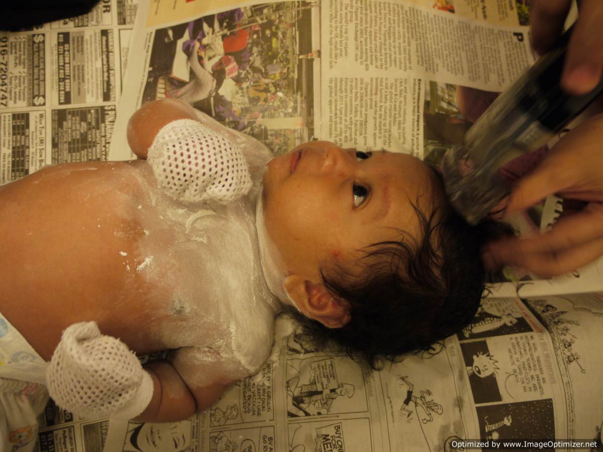 Sesi tanggalkan baju, baju budak tu ye maksud aku.. pastu tabur bedak sket kat keliling leher dia.. kang rambut2 tu melekat2 kat badan lak kalo tak taruk bedak..